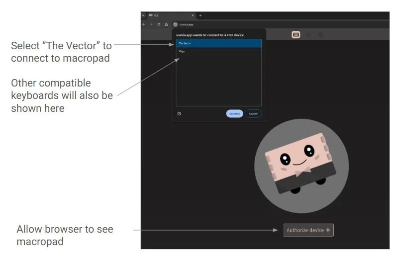 See Image 2 to see how to connect to the Vector using the web-app. The web-app will auto-detect your connected Vector macropad.